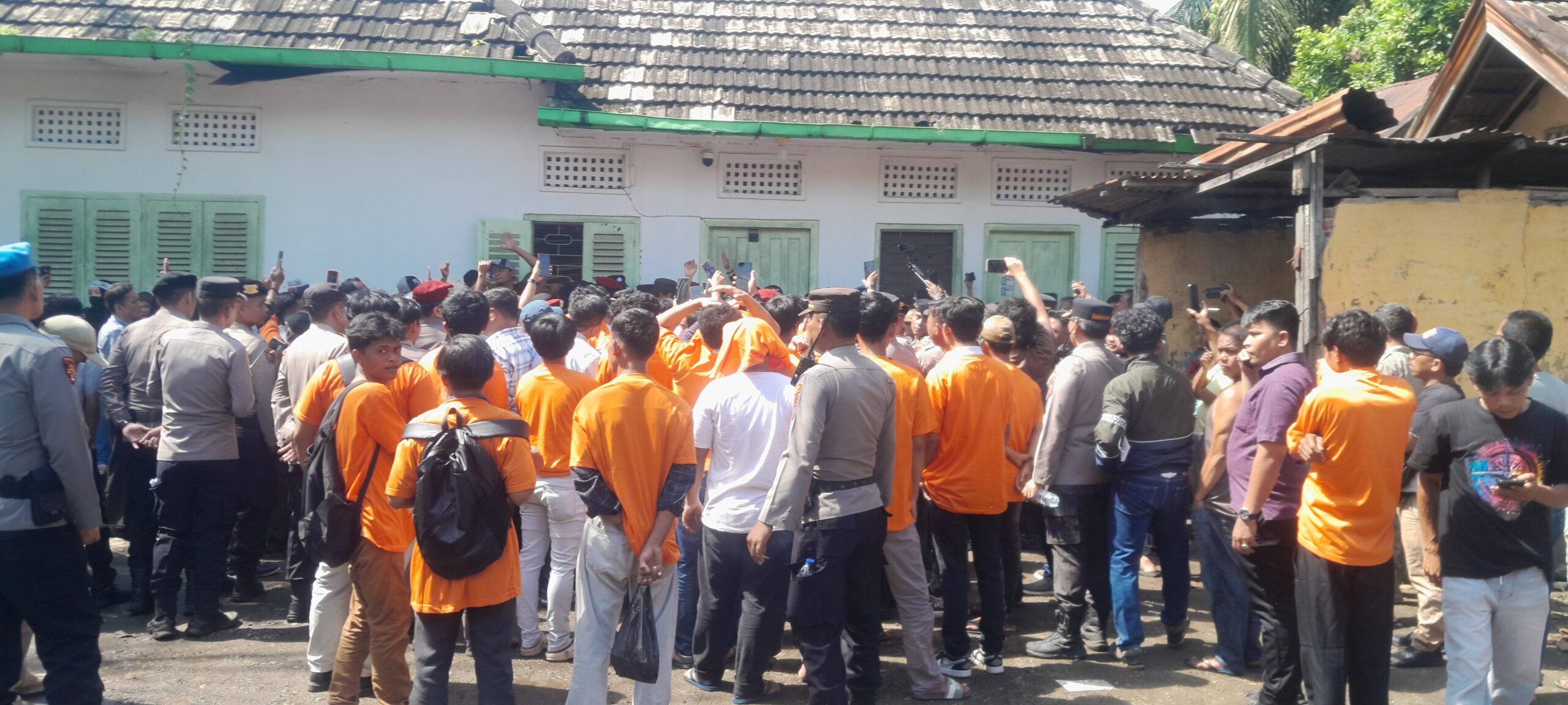 Di sisi lain, sejumlah massa pendukung terlihat hadir di lokasi. Sebagian di antaranya mengenakan ikat kepala bertuliskan “Save dr Bajora” sebagai bentuk solidaritas. Selain itu, tampak pula kelompok pemuda dengan kaos berwarna oranye yang ikut memadati area sekitar rumah.