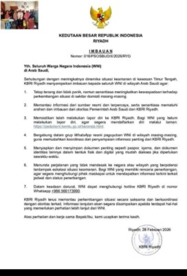 KompasReal.id, Sehubungan dengan eskalasi ketegangan dan potensi konflik terbuka yang semakin meningkat di kawasan Timur Tengah, kami mengimbau kepada seluruh Warga Negara Indonesia (WNI) agar meningkatkan kewaspadaan secara ekstrem. Situasi geopolitik yang dinamis menunjukkan bahwa negara-negara tetangga telah berada dalam status siaga penuh, dan kita tidak dapat memprediksi eskalasi yang mungkin terjadi dalam beberapa jam atau hari ke depan.