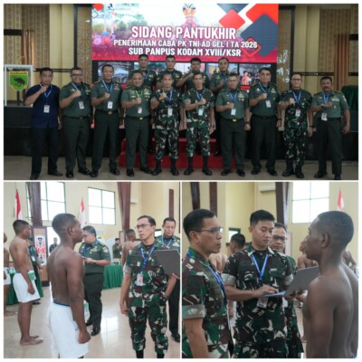 KompasReal.id, Manokwari – Pangdam XVIII/Kasuari, Mayjen TNI Christian Kurnianto Tehuteru, memimpin Sidang Pemilihan Tingkat Sub Panitia Pusat (Sub Panpus) Penerimaan Calon Bintara Prajurit Karier (Caba PK) TNI AD Gelombang I TA 2026 di Makodam XVIII/Kasuari, Manokwari, Papua Barat, Kamis (19/2/2026). Sidang ini diikuti oleh 104 calon bintara.