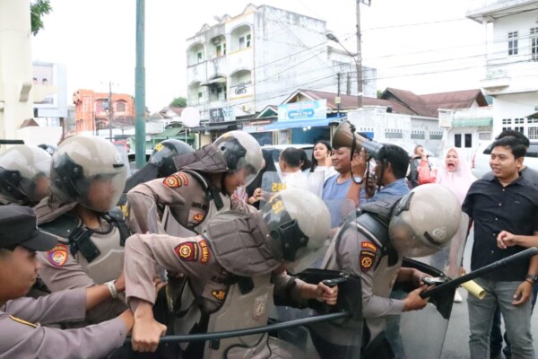 Petugas negosiator dari fungsi Binmas melakukan pendekatan persuasif kepada massa, namun situasi meningkat sehingga personel Dalmas awal dan lanjutan dikerahkan. Mereka melakukan pengendalian massa sesuai prosedur tetap dengan penggunaan perlengkapan seperti tameng dan tongkat, guna menjaga situasi tetap terkendali.