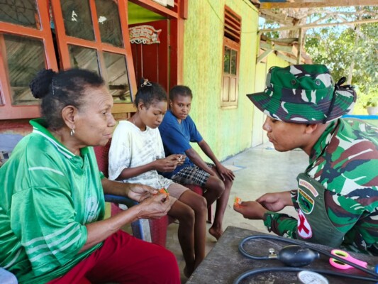 Petugas Kesehatan Satgas TMMD ke-128 Kodim 1801/Manokwari, Serda Prasetyo, menyampaikan bahwa pelayanan kesehatan dilakukan secara langsung di posko TMMD serta melalui kunjungan ke rumah warga yang membutuhkan penanganan medis.
